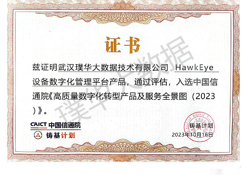 武汉璞华大数据技术有限公司HawkEye设备数字化管理平台产品,凭借优秀的产品技术能力,通过评估后,入选中国信通院“铸基计划”《高质量数字化转型产品及服务全景图(2023)》的工业数字化领域。 “铸基计划”是中国信通院推出的高质量数字化转型推进专项行动,专注于企业数字化转型中面临的痛点、难点问题,利用中国信通院在数字技术领域的深入理解,通过链接数字化转型供给侧和需求侧,更好地引导各行各业数字化建设,服务产业界更高效推进数字化升级,帮助用户更好地获取数字化的产品技术支持和应用服务。 武汉璞华大数据技术有限公司将大数据技术、AI技术、物联网技术与垂直领域行业知识相结合,为企业提供设备服务生命周期管理(SLM)产品及解决方案。 公司自主研发了HawkEye设备数字化管理平台、物联网大数据平台、满足ITIL4的一体化IT运维平台、项目管理平台、交互式电子技术手册平台、安全作业票管理平台、维修MES生产管理系统等,为企业的数字化转型赋能。 璞华大数据深耕垂直细分领域,服务行业覆盖军、民领域,包括智慧工厂、轨道交通、能源化工、军工制造等行业市场。自成立以来,璞华大数据始终坚持自主创新,保持着持续的高增长,产品及服务获得了行业的广泛认可。 未来,公司将保持创新,深耕市场,不断完善产品,为数字化经济增添新的动力。